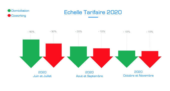 1. La souplesse tarifaire Pour répondre à ces nouvelles contraintes et prendre en compte cette nouvelle réalité, nous avons su ajuster nos offres en matière de coworking et de domiciliation d’entreprise. Nous affichons clairement notre volonté de participer activement à la relance économique.